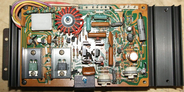Une fois le capot enlevé, gros soupir... le gros condensateur de filtrage de 2 x 13.000 uF a disparu, et a laissé sa place à un bricolage de petits condensateurs attachés au tape et soudés très approximativement :
